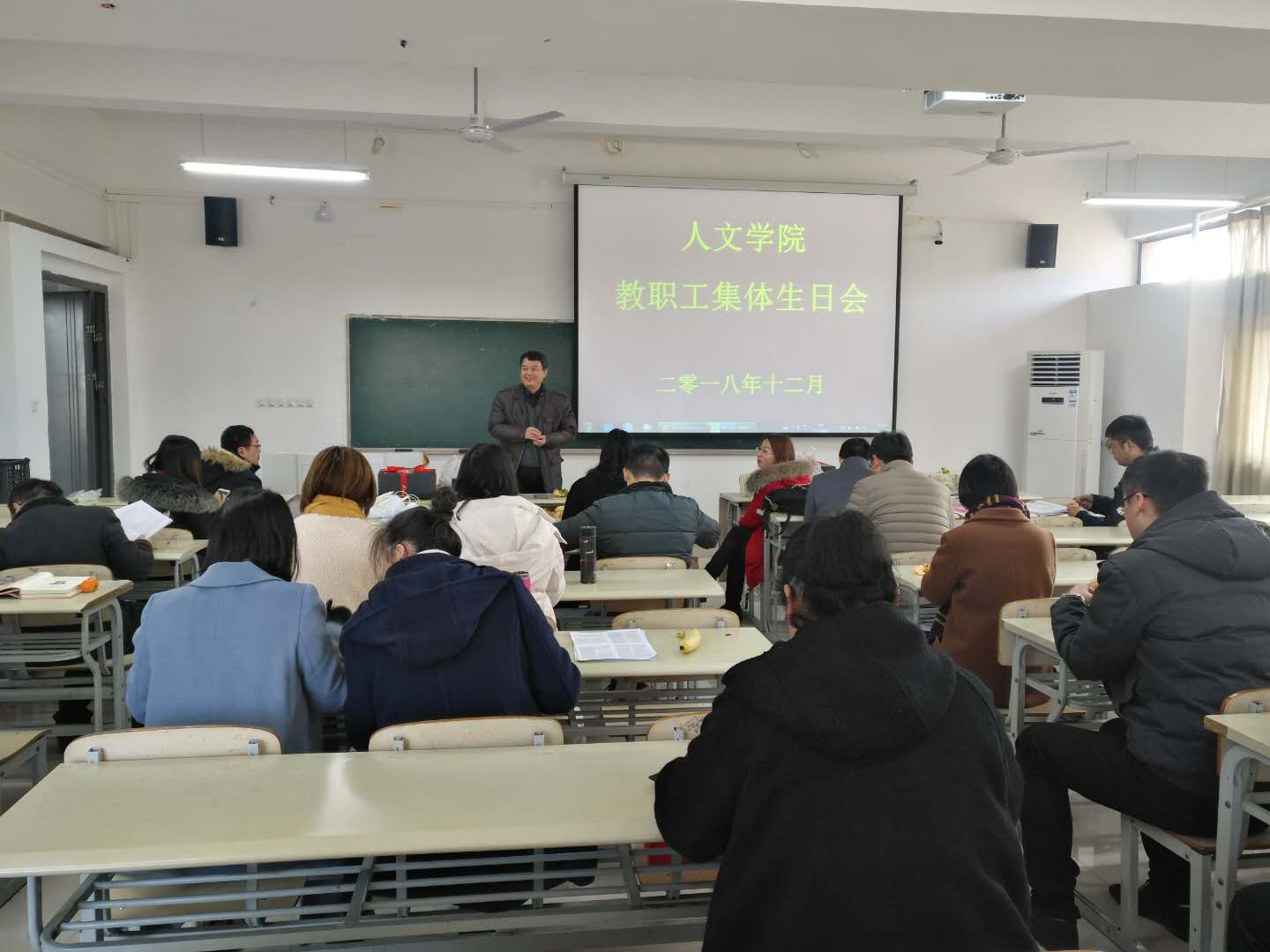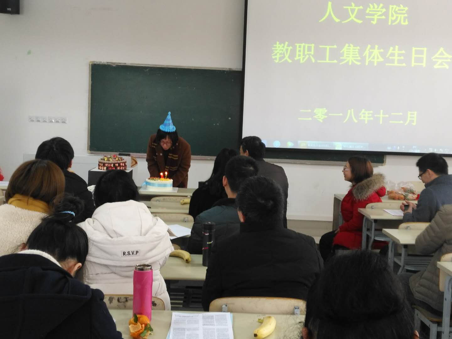 12月14日上午,香蕉网 在学院A333教室举办2018年教职工集体生日会,分工会主席主持会议,学院党政领导和全体教师参加了集体生日会。