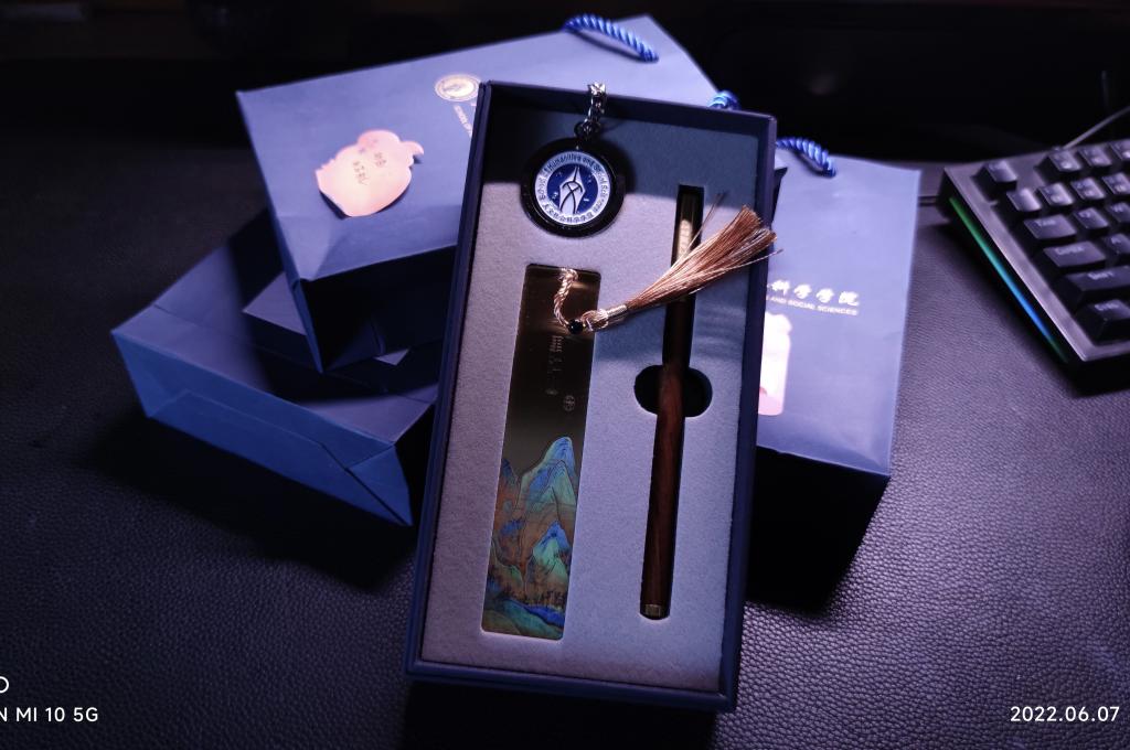 学院为2022届毕业生定制专属纪念礼品套盒,一个刻有本人姓名和学院标识的钥匙扣,一个刻有“崇文尚美 经世重法”学院院训的书签,和一根象征着前程似锦的定制笔。将片片真情送给学生,希望全体毕业生怀揣母校恩情,在新的征程上披荆斩棘!
