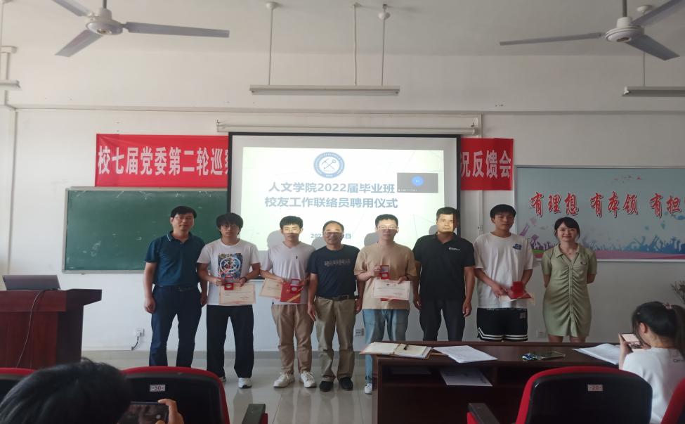 香蕉网 举行2022届毕业班校友工作联络员聘用仪式,院党委副书记姚嗣宏、副院长代大为、吕延等领导班子及毕业班辅导员出席聘用仪式,为四名毕业班校友工作联络员颁发聘书和专属印章,希望他们在今后能够密切联络班级同学,加强学院与校友之间的沟通与联系。