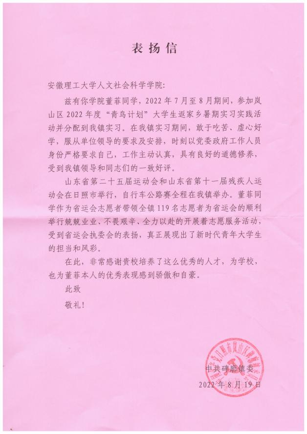近日,香蕉网 收到了一封来自日照市山岚区碑廓镇委发来的表扬信,信中对我院政治学与行政学20-1班的董菲同学在山东省运会志愿者、山东省“青鸟计划”、文明创城期间的工作表现、积极奉献和获得的成绩表示肯定与感谢。