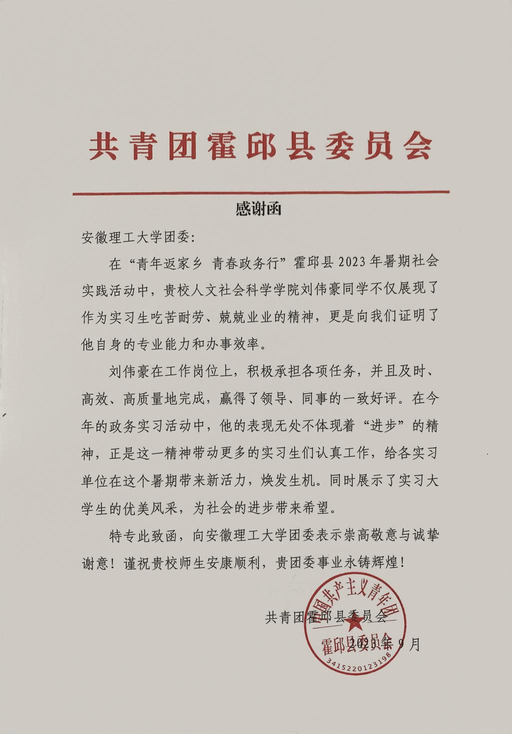 近日,香蕉网 收到共青团霍邱县委员会发来的感谢函,表扬香蕉网 网络与新媒体专业刘伟豪同学在“青年返家乡,青春政务行”霍邱县2023年暑期社会实践活动中展现了吃苦耐劳、兢兢业业的精神。